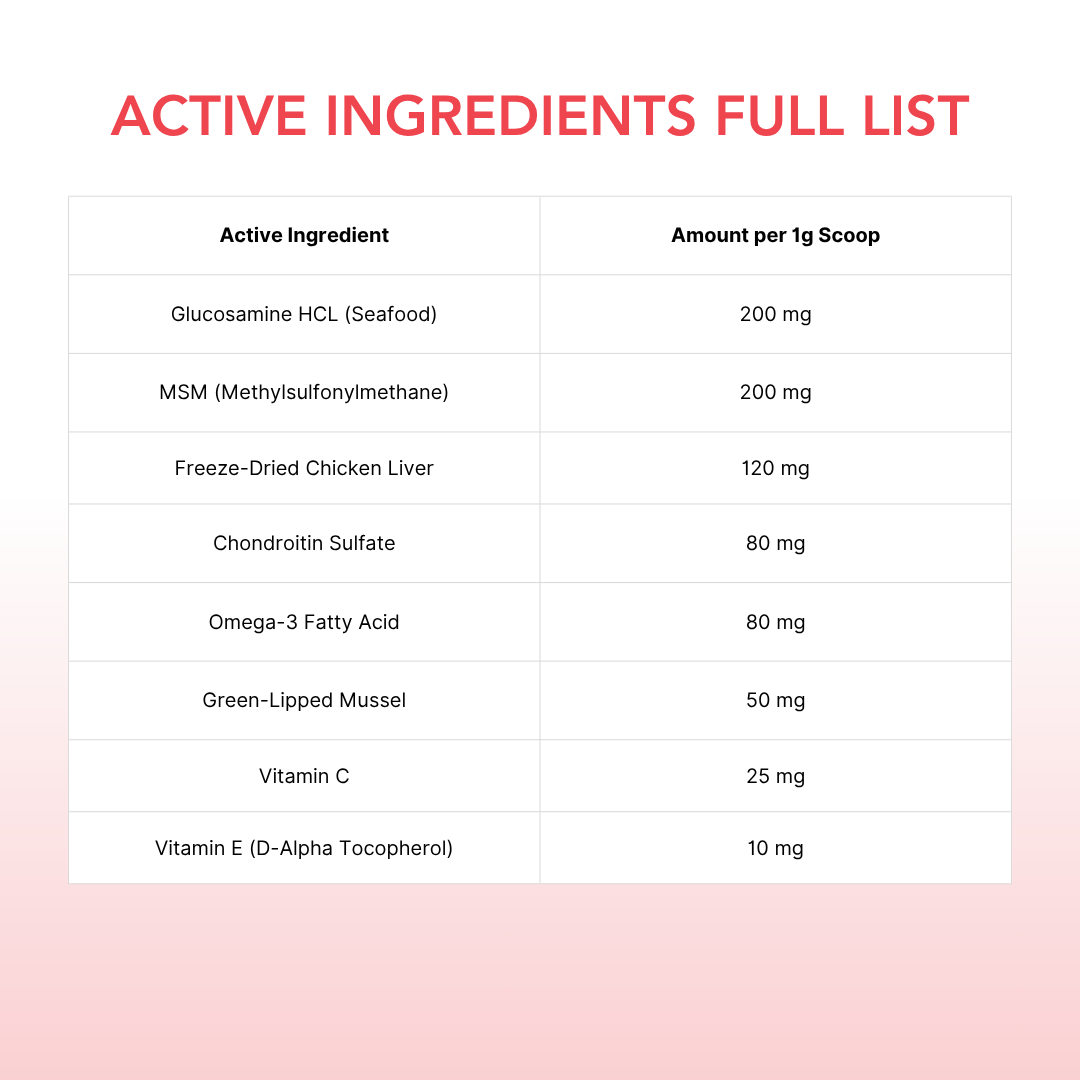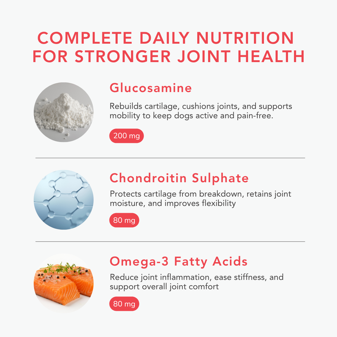Our unique & natural blend of pure Glucosamine HCI, MSM & Chondroitin is professionally formulated to help maintain joint health and support mobility in dogs. Our Hip & Joint meal topper is made without any added fillers, artificial flavoring, or artificial colors.