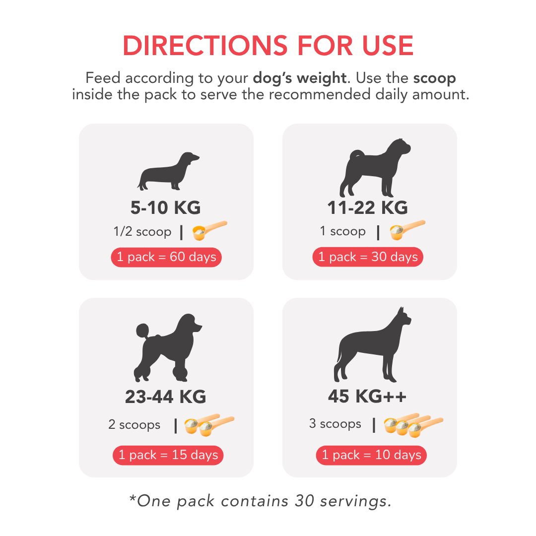 Simply add the below amount to your dog’s wet or dry food each day for optimal results.