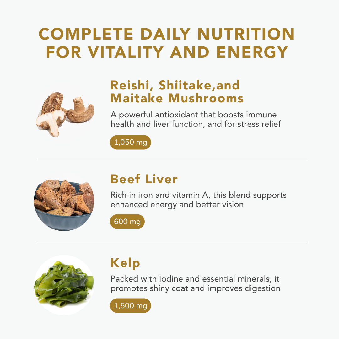 Rich in superfoods such as mushrooms, beef liver, and green-lipped mussels, this vet-formulated supplement enhances your dog's overall well-being, giving your beloved pooch a chance to thrive.