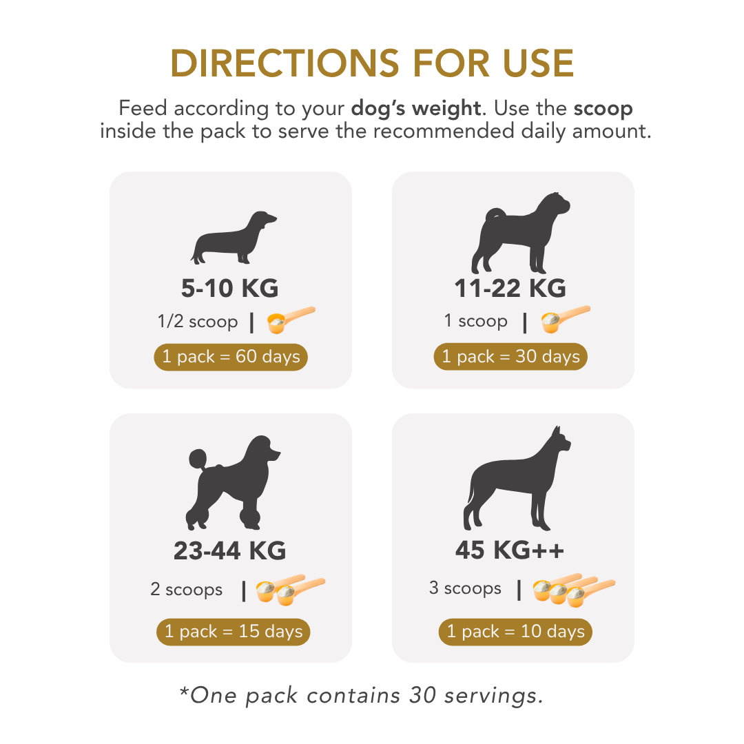 Simply add the below amount to your dog’s wet or dry food each day for optimal results.